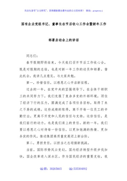 / 国有企业党组书记、董事长在节后收心工作会暨新年工作部署启动会上的讲话