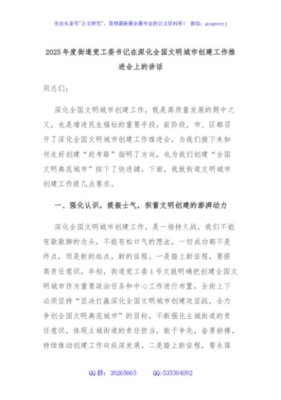 / 2025年度街道党工委书记在深化全国文明城市创建工作推进会上的讲话