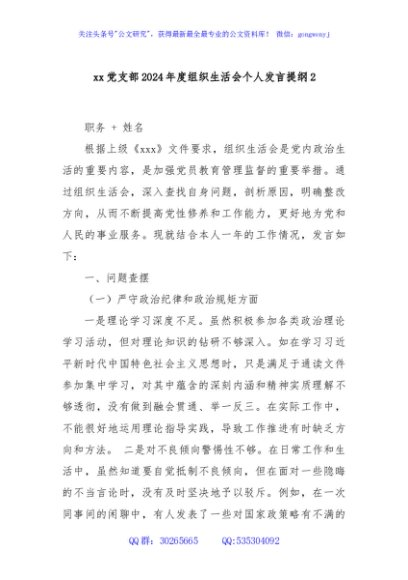 / xx党支部2024年度组织生活会个人发言提纲2