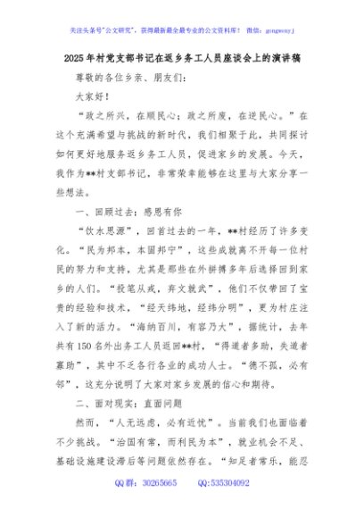 / 2025年村党支部书记在返乡务工人员座谈会上的演讲稿