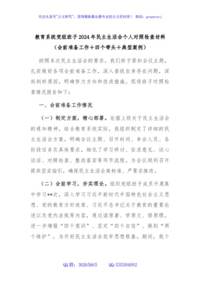 / 教育系统党组班子2024年民主生活会个人对照检查材料(会前准备工作+四个带头+典型案例)
