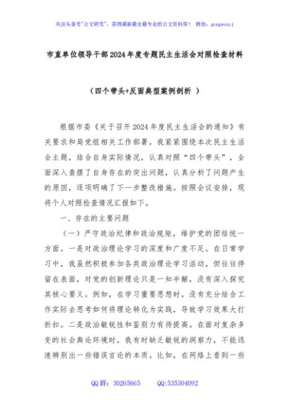 / 市直单位领导干部2024年度专题民主生活会对照检查材料(四个带头+反面典型案例剖析 )