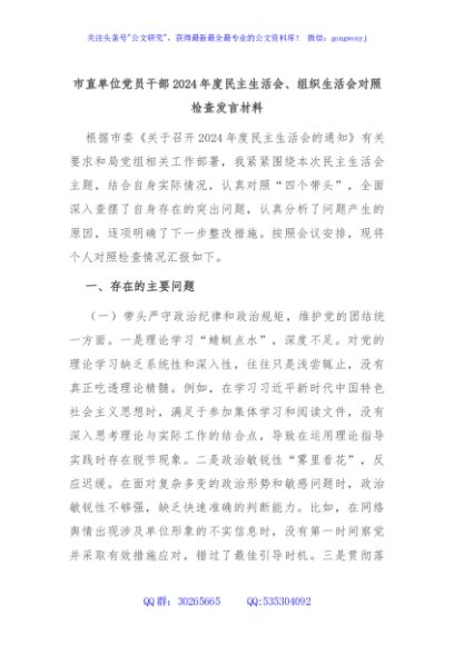 / 市直单位党员干部2024年度民主生活会、组织生活会对照检查发言材料