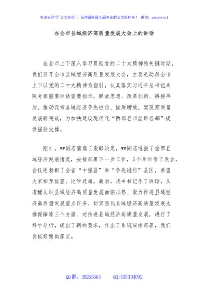 / 在全市县域经济高质量发展大会上的讲话
