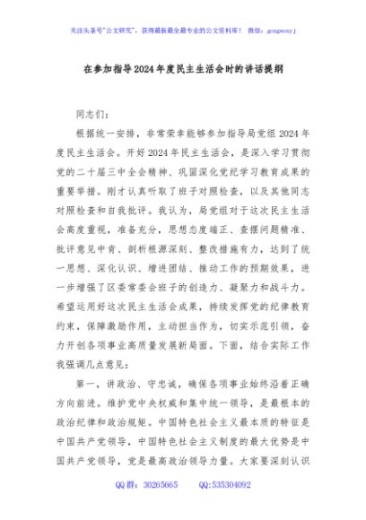 / 在参加指导2024年度民主生活会时的讲话提纲