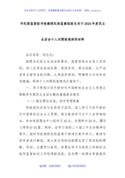 / 市纪委监委驻市检察院纪检监察组组长关于2024年度民主生活会个人对照检视剖析材料