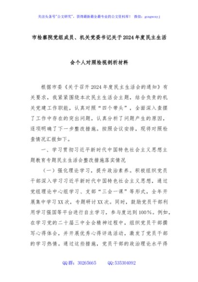 / 市检察院党组成员、机关党委书记关于2024年度民主生活会个人对照检视剖析材料