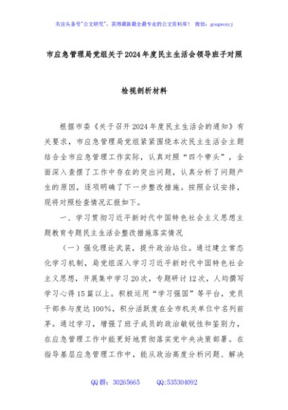 / 市应急管理局党组关于2024年度民主生活会领导班子对照检视剖析材料