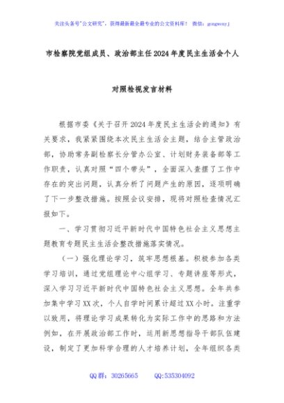 / 市检察院党组成员、政治部主任2024年度民主生活会个人对照检视发言材料