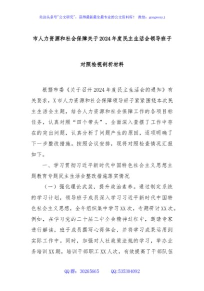 / 市人力资源和社会保障关于2024年度民主生活会领导班子对照检视剖析材料