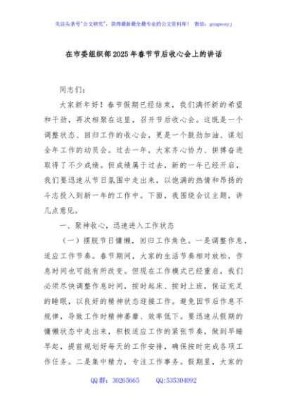 / 在市委组织部2025年春节节后收心会上的讲话