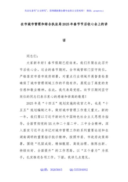 / 在市城市管理和综合执法局2025年春节节后收心会上的讲话