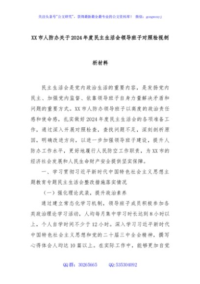 / XX市人防办关于2024年度民主生活会领导班子对照检视剖析材料