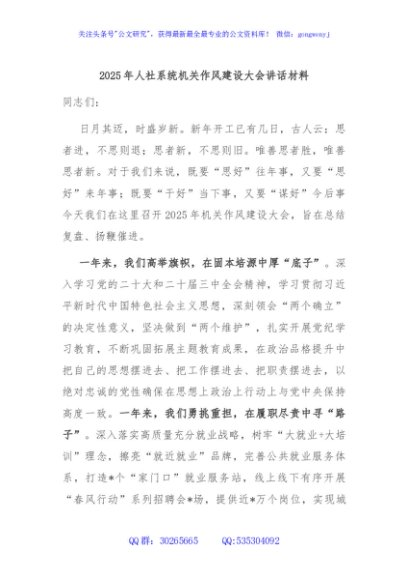 / 2025年人社系统机关作风建设大会讲话材料