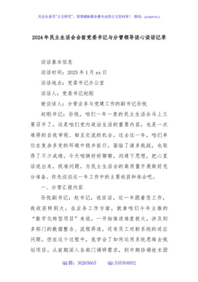 / 2024年民主生活会会前党委书记与分管领导谈心谈话记录