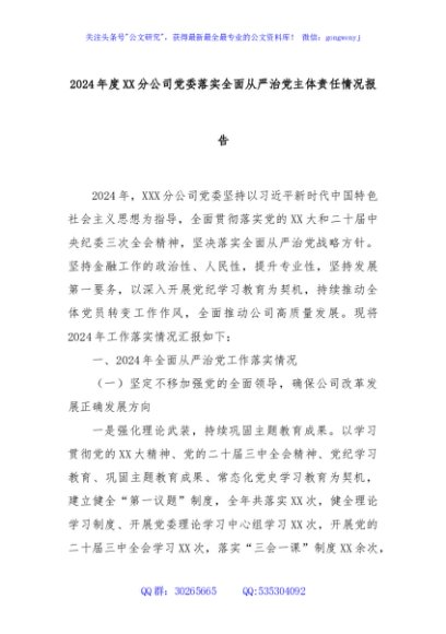 / 2024年度XX分公司党委落实全面从严治党主体责任情况报告