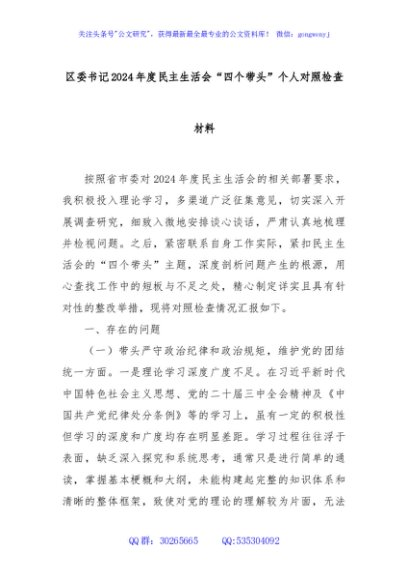 / 区委书记2024年度民主生活会“四个带头”个人对照检查材料
