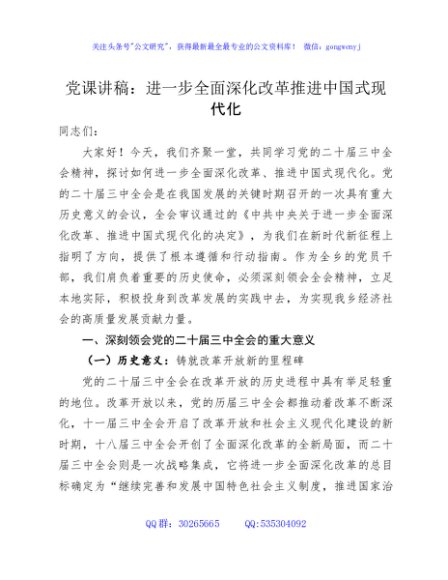 / 党课讲稿:进一步全面深化改革推进中国式现代化