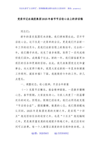 / 党委书记在城投集团2025年春节节后收心会上的讲话稿