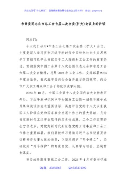 / 市常委同志在市总工会七届二次全委(扩大)会议上的讲话