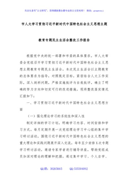 / 市人大学习贯彻总书记新时代中国特色社会主义思想主题教育专题民主生活会整改工作报告