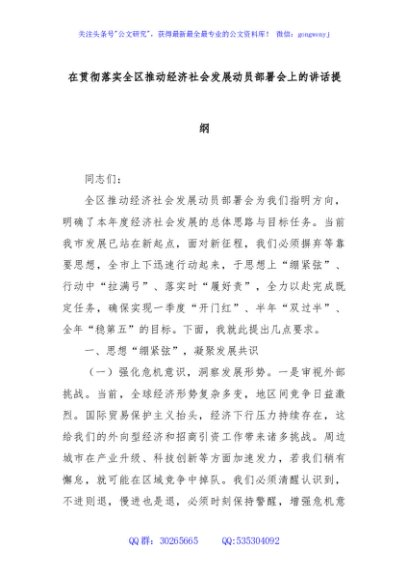 / 在贯彻落实全区推动经济社会发展动员部署会上的讲话提纲