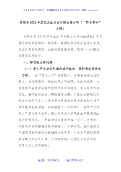 / 局领导2024年度民主生活会对照检查材料(“四个带头”方面)