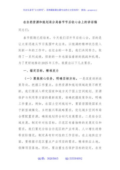 / 在自然资源和规划局分局春节节后收心会上的讲话稿