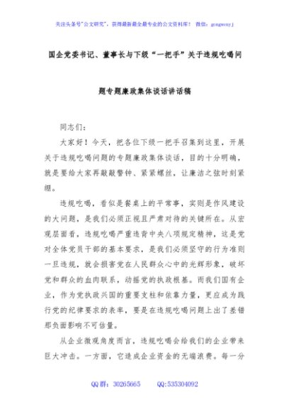 / 国企党委书记、董事长与下级“一把手”关于违规吃喝问题专题廉政集体谈话讲话稿