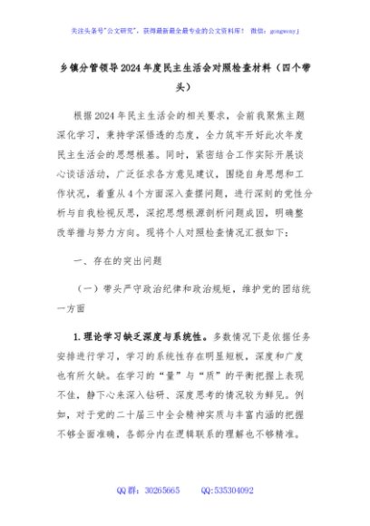 / 乡镇分管领导2024年度民主生活会对照检查材料(四个带头)