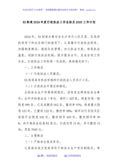 / XX街道2024年度行政执法工作总结及2025工作计划