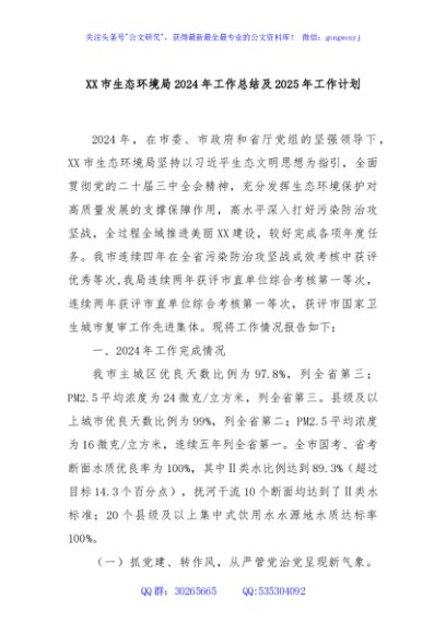 / XX市生态环境局2024年工作总结及2025年工作计划