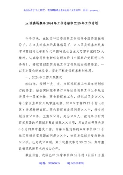 / xx区委巡察办2024年工作总结和2025年工作计划