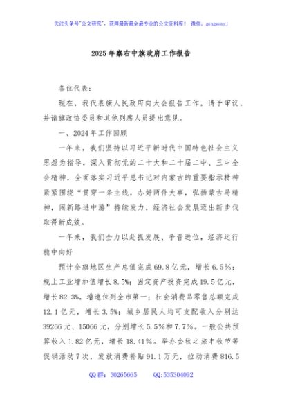 / 2025年察右中旗政府工作报告
