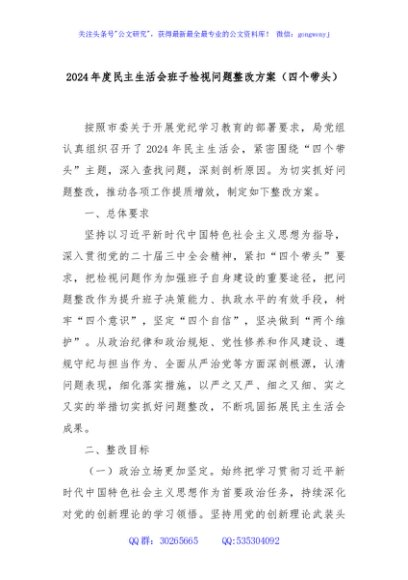 / 2024年度民主生活会班子检视问题整改方案(四个带头)