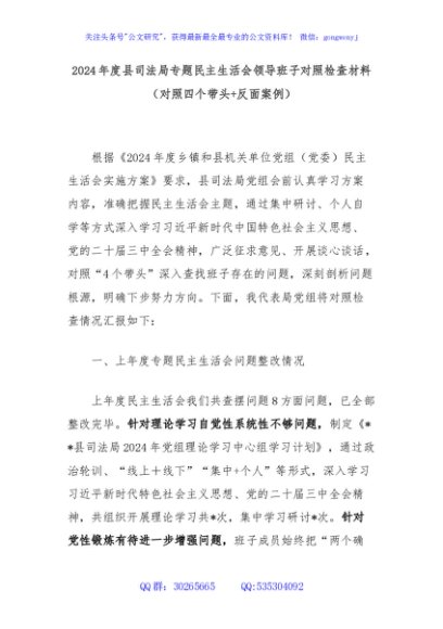 / 2024年度县司法局专题民主生活会领导班子对照检查材料(对照四个带头+反面案例)