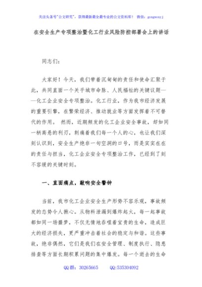 / 在安全生产专项整治暨化工行业风险防控部署会上的讲话