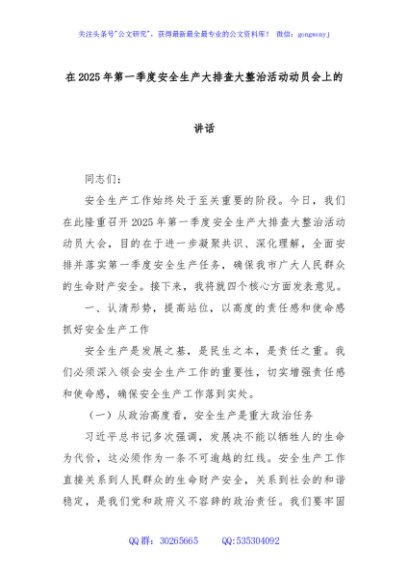 / 在2025年第一季度安全生产大排查大整治活动动员会上的讲话