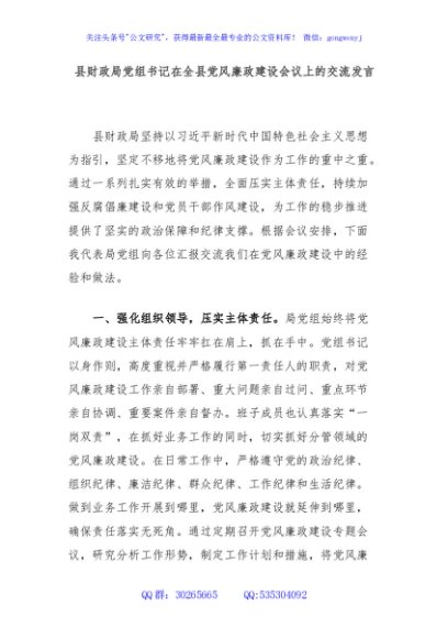 / 县财政局党组书记在全县党风廉政建设会议上的交流发言