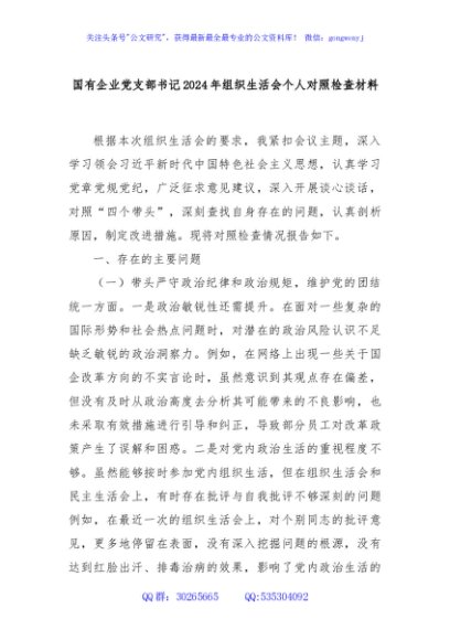 / 国有企业党支部书记2024年组织生活会个人对照检查材料
