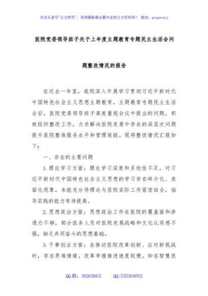 / 医院党委领导班子关于上年度主题教育专题民主生活会问题整改情况的报告