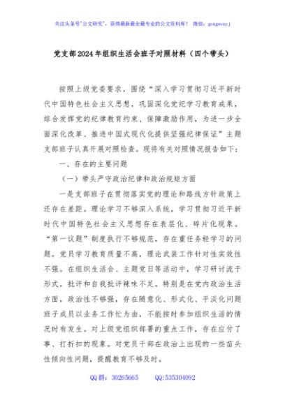 / 党支部2024年组织生活会班子对照材料(四个带头)