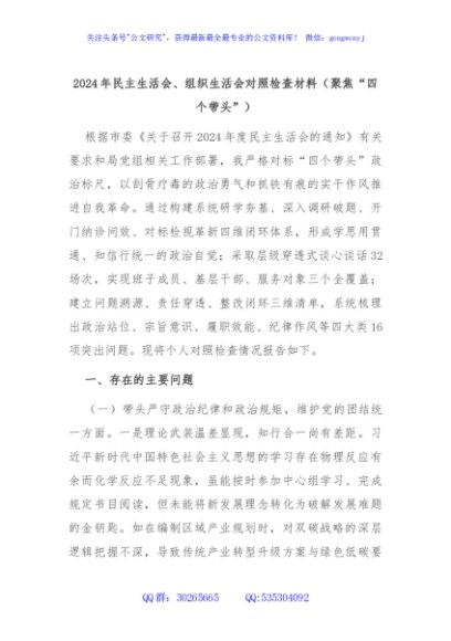 / 2024年民主生活会、组织生活会对照检查材料(聚焦“四个带头”)