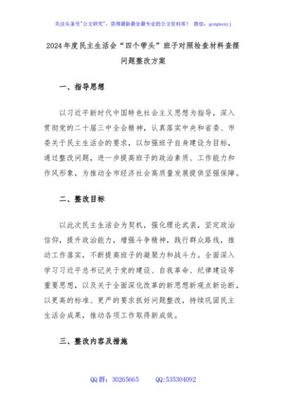 / 2024年度民主生活会“四个带头”班子对照检查材料查摆问题整改方案