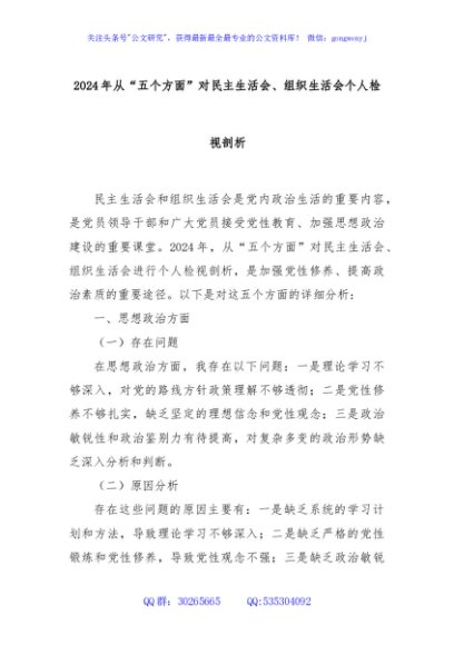 / 2024年从“五个方面”对民主生活会、组织生活会个人检视剖析
