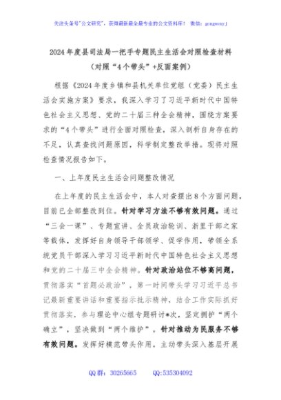 / 2024年度县司法局一把手专题民主生活会对照检查材料(对照“4个带头”+反面案例)