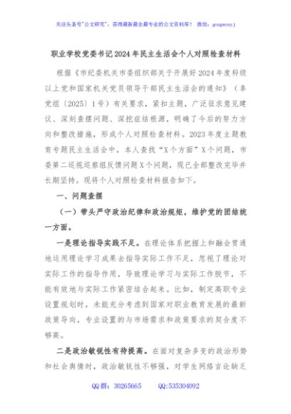 / 职业学校党委书记2024年民主生活会个人对照检查材料