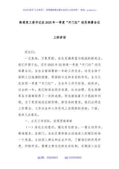 / 街道党工委书记在2025年一季度“开门红”动员部署会议上的讲话