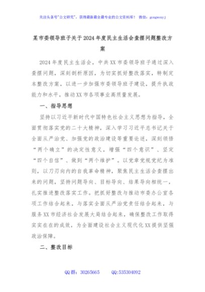 / 某市委领导班子关于2024年度民主生活会查摆问题整改方案