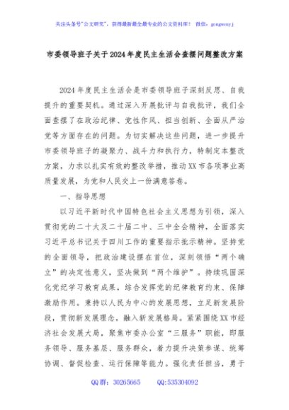 / 市委领导班子关于2024年度民主生活会查摆问题整改方案